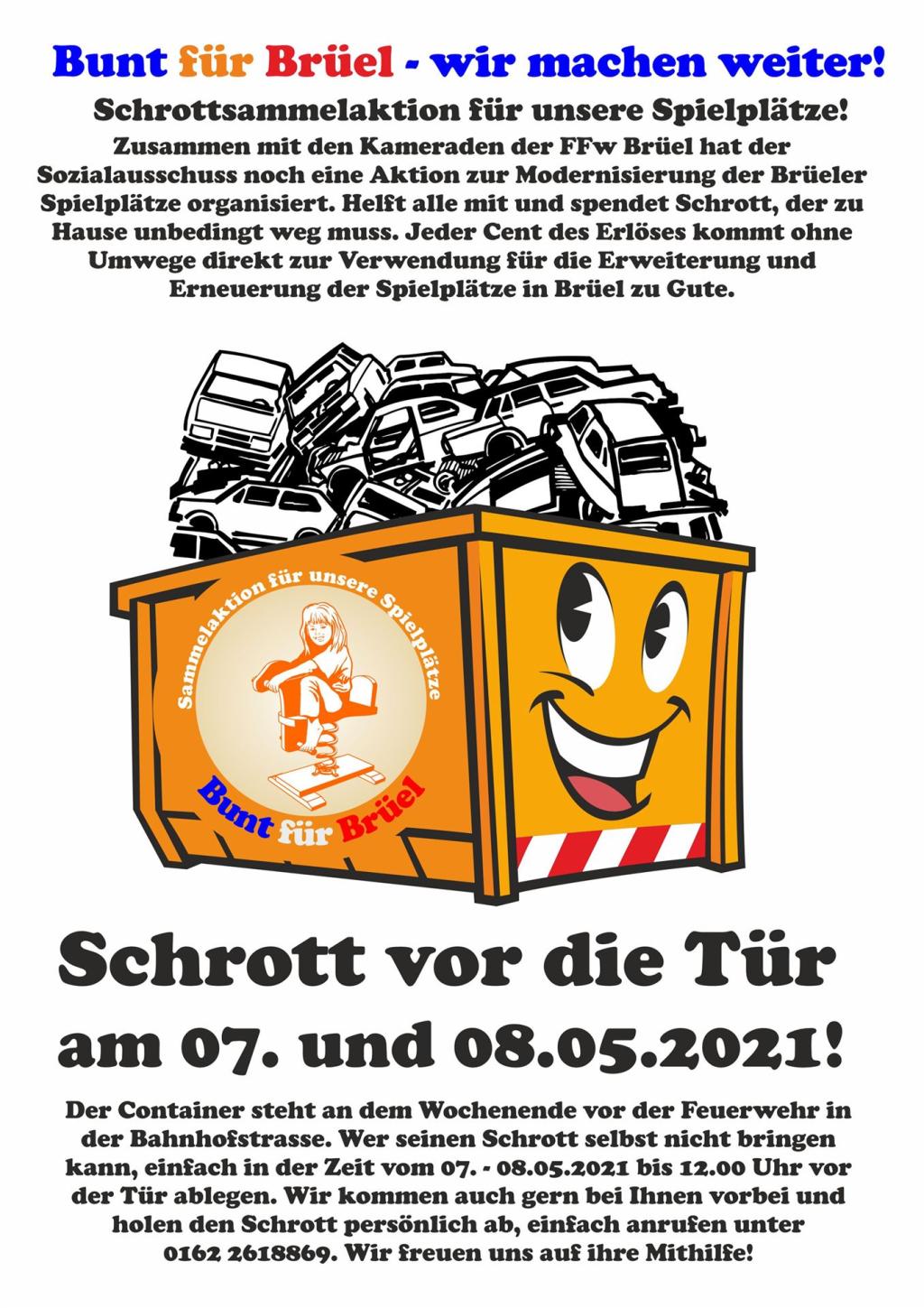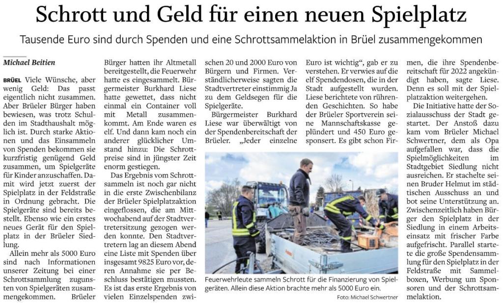 04.06.2021 - Was soll ich sagen, ihr lieben Brüeler, Spender und Sponsoren. Eine tolle Aktion und ein toller Artikel der SVZ. Korrigieren möchte ich zwei Sachen, denn es waren nicht 11 sondern 7 Container Schrott mit einer Gesamtmasse von 32 Tonnen. So beläuft sich inkl. der Schrottaktion die Summe der Spenden auf derzeit insgesamt 17.832,24 Euro. Das ist der Moment, an dem ich mich ganz herzlich bei allen Geldgebern, Helfern und Sponsoren bedanken möchte. Ganz besonders bei meinen Kollegen vom Bauhof, den Kameraden der Feuerwehr, den Gewerbetreibenden, Vereinen und ganz besonders bei den Brüeler Bürgern, die unermüdlich Geld und Schrott gegeben haben, um die Aktion so zu einem Erfolg werden zu lassen. Und natürlich bei dem Ideengeber und Koordinator Michal Schwertner sowie dem Sozialausschuss. Wie geht es nun weiter. Der Spielplatz für die Feldstraße erhält 4 neue Spielgeräte, die Reckstange, Schaukel und der Sandkasten ziehen mit um. Das wird gebaut, sobald das Material geliefert wird. Der Spielplatz in der Siedlung erhält einen kleinen Rutschen Turm und zwei Federtiere, die liebevoll von Michael Schwertner neu aufgearbeitet wurden. Und, wie geht es dann weiter. Für das nächste Jahr wollen wir den hinteren Teil der Festwiese mit einem neuen Spielplatz ausrüsten. Dazu wird der derzeitige Standort am Rosenweg mit umziehen und wenn wir die beantragten Fördermittel bekommen, wird hier ein großer Spielplatz mit Bänken und Spielgeräten entstehen. Dazu kommt unser Stadtjubiläum und die geplante 800 Jahr Feier. Ihr seht, wir haben viel vor. Ich freue mich auf die Herausforderungen. Geplant ist die Festwoche in der Zeit vom 30.05.2022 bis 05.06.2022. Gern nehmen wir auch noch Ideen zur Umsetzung der Feierlichkeiten entgegen.