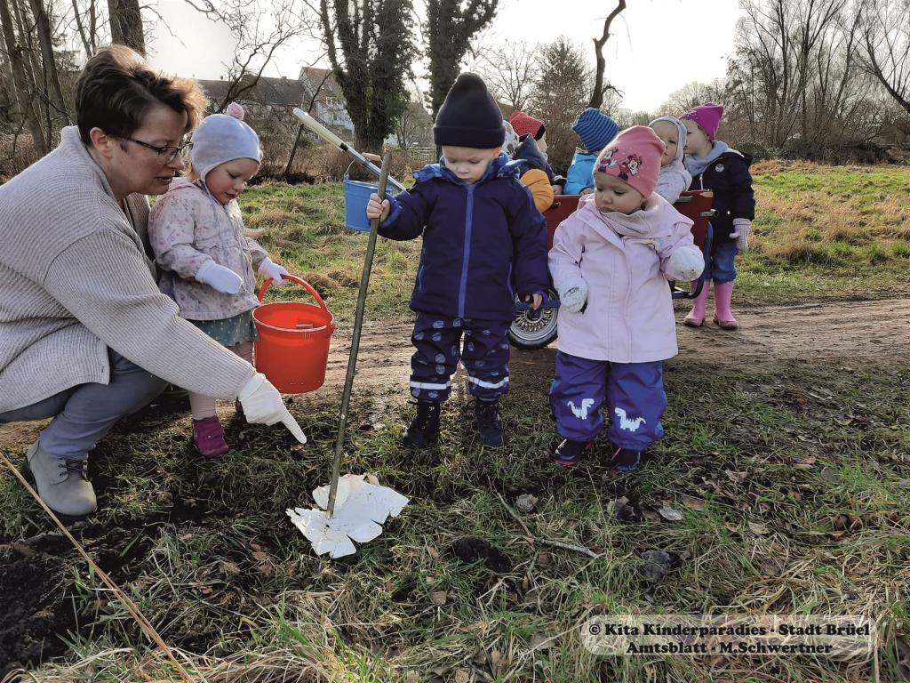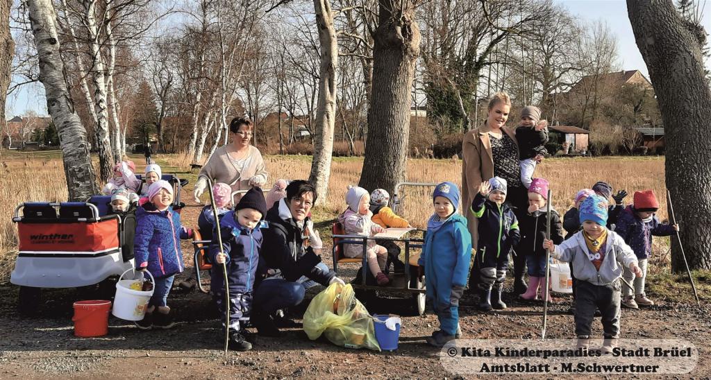 Klein Aber – Oho! „Oh, die liebe Sonne ist da!“ Als letzte Woche die Sonne durch die Fenster im Kindergarten scheint, freut sich Louis und wedelt aufgeregt mit den Armen. Um die ersten kräftigen Sonnenstrahlen zu begrüßen, machen die Krippenkinder an diesem Tag einen Spaziergang, auf der Suche nach den ersten Frühlingsboten. Doch es kommt ganz anders! „Iiiihhh…. Guck mal“, ruft Louis und zeigt auf den Grasstreifen am Wegesrand. Müll, überall Müll. Auch wir Erzieher waren über diesen Anblick sehr erschrocken. Neben Taschentüchern, Chipstüten, Kaffeebechern, Alltagsmasken und Zigarettenschachteln, fanden wir auch jede Menge Hundehaufen und Hundekotbeutel. Nachdem wir den Kindern erklärt hatten, wie schlimm der Müll für die Natur und die Tiere ist, beschlossen wir wenigstens erste Schritte zur Besserung zu machen. Mit Handschuhen, Eimern und Müllpiekern ausgestattet, wollten die Kleinsten einen Beitrag leisten, der in ihrem Alter möglich ist. Wobei bestimmt jeder nachvollziehen kann, dass die Hundehaufen und Kotbeutel nicht von den Kindern beseitigt wurden. Aber Veränderungen fangen im Kleinen an. Vielleicht achtet jeder ein bisschen mehr auf seine Umgebung und hilft mit, Brüel schöner zu machen.