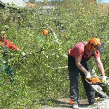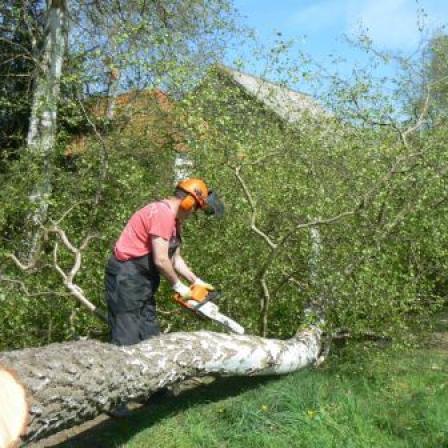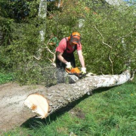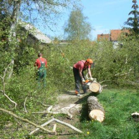 Zuerst befestigen die Arbeiter ein Sicherungsseil nahe der Baumkrone, dann wird ein Fallkerb gesetzt, welcher dem Baum die Fallrichtung vorgibt, dann wird das Seil gespannt und der Mann an der Säge setzt zum Fällschnitt an. Hell singend durchtrennt die Säge den Stamm, Sekunden später kracht die Birke in die gewünschte Richtung. Der Stamm wird ausgeästet und die Stelle anschließend beräumt. Baum um Baum verschwindet so von der Bildfläche.