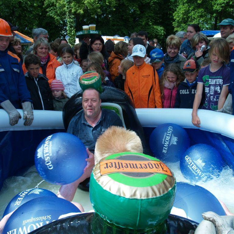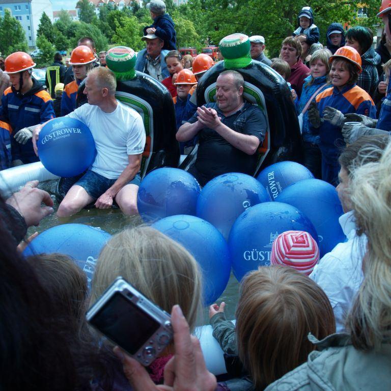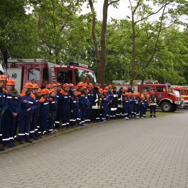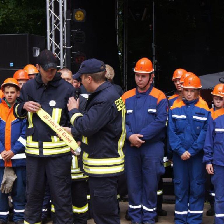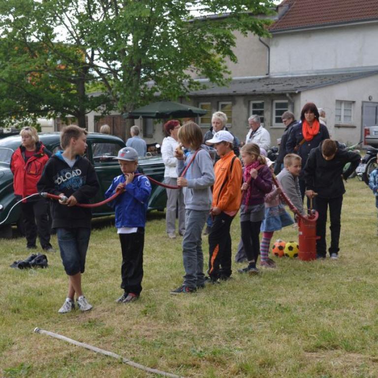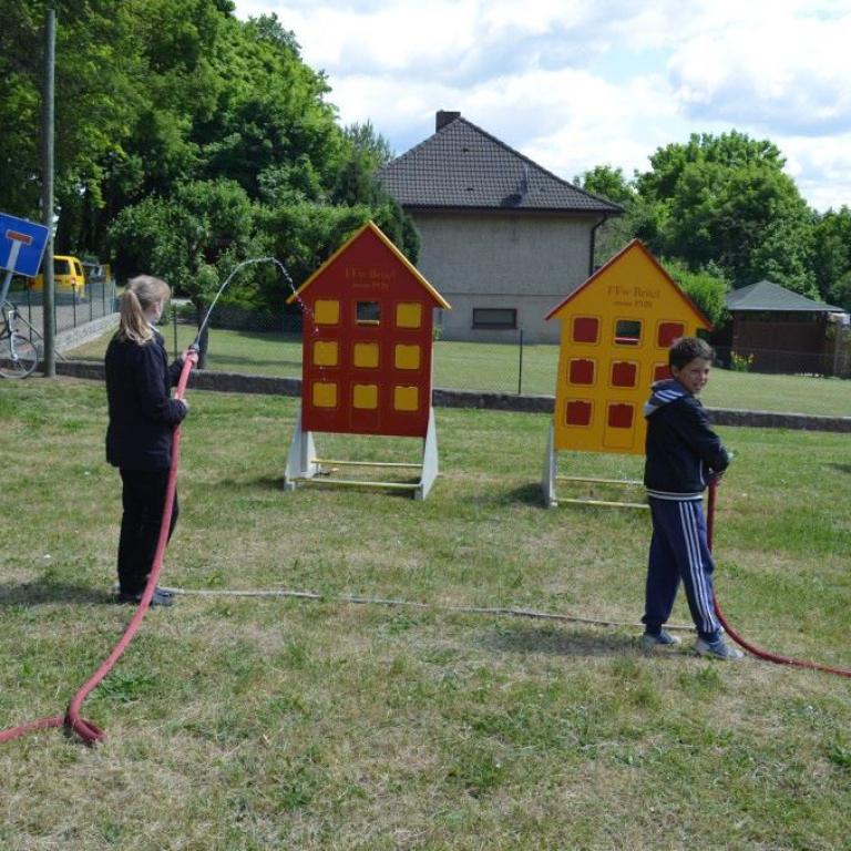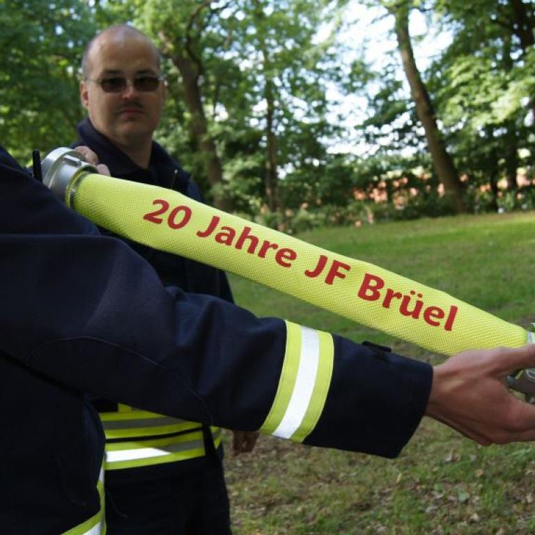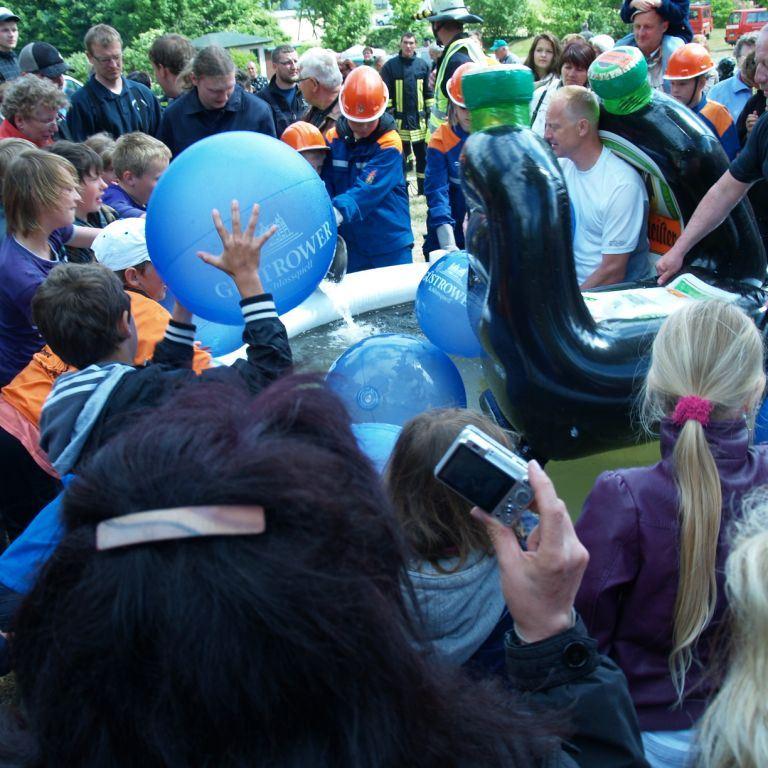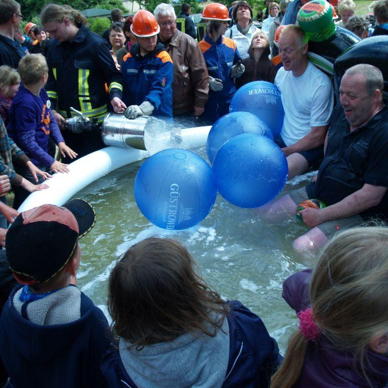 Der Grund war eine Wette zwischen der Stadt Brüel und der Jugendfeuerwehr des Ortes. Die Stadtvertreter glaubten nicht, dass es möglich ist Wasser aus dem Roten See bis zum Vogelstangenberg zu fördern. Das ist eine Strecke von 1,8km. Natürlich ließen die Jugendfeuerwehren des Amtes und der Umgebung die Brüeler Kameraden nicht allein und arbeiteten gemeinsam an der Erfüllung des Ziels. Bis zum Schluss war der Ausgang der Wette unklar. Mehrere Schläuche platzten und mussten schnellstmöglich, durch bereitgelegte Reserve, getauscht werden. Punkt 14:30 Uhr kam der Funkspruch: "Wir haben die Wette gewonnen!!!". Insgesamt 65 Jugendfeuerwehrleute und deren Ausbilder freuten sich über die erbrachte Leistung, denn durch den Sieg kamen durch Sponsoren rund 800,- Euro für ein neues Spielgerät für den Spielplatz vor der Schule zusammen.